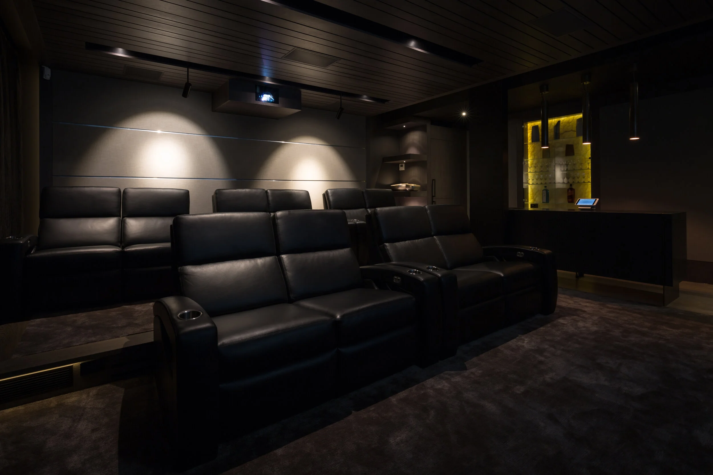 Hidden cabling, discreet speaker placement, and tidy equipment locations keep the interior looking sharp.