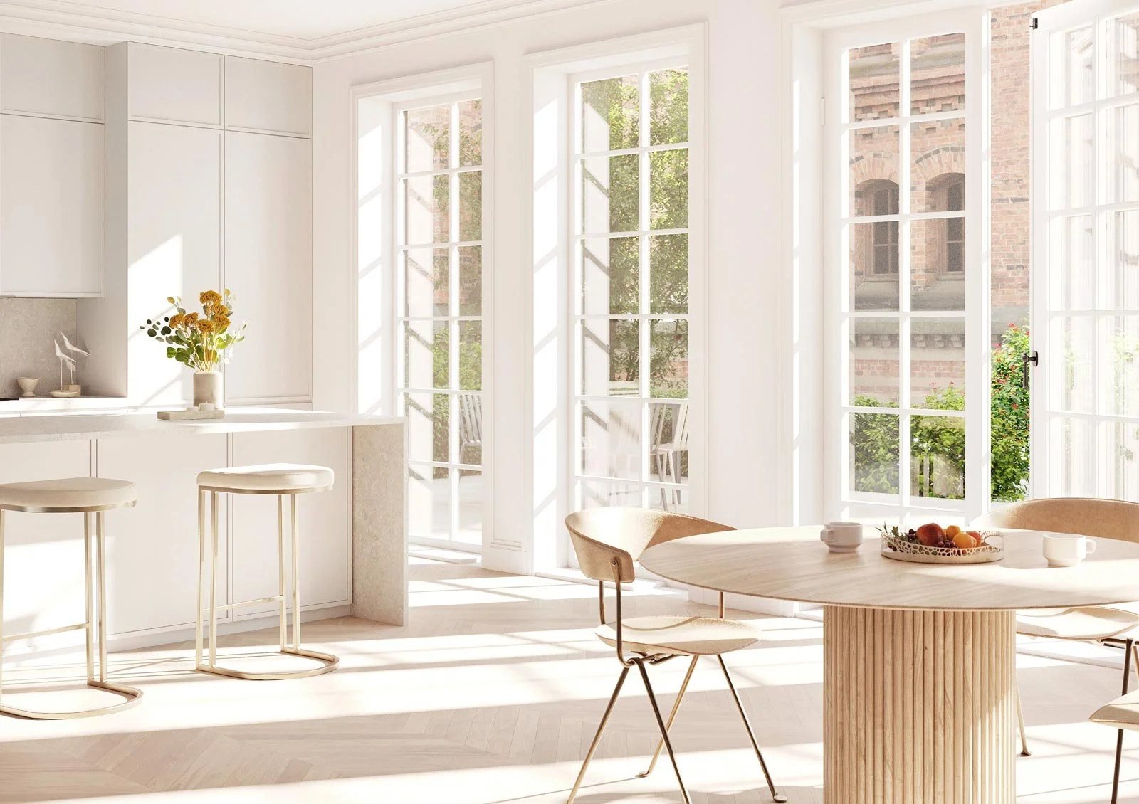 Morning: bedroom shades open gently, living areas follow
